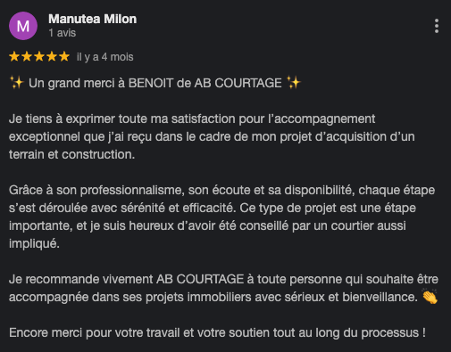 Nos clients mettent également en avant la qualité du montage financier, la rapidité de traitement des dossiers et la capacité à obtenir de bonnes conditions de prêt.